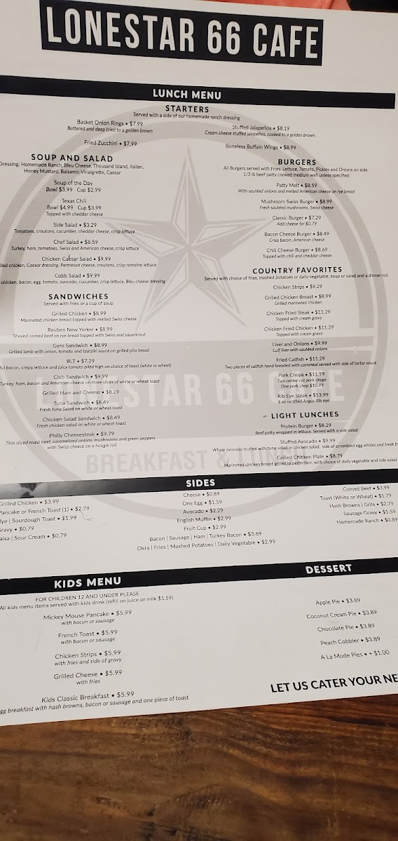 Introducing the menu at Lone Star 66 Cafe, located in Rockwall, Texas, offers a delightful blend of comfort food and traditional Texas flavors. From the satisfying Texas Chili topped with cheddar cheese to the refreshing Chicken Caesar Salad, the selections are both hearty and flavorful. The Chef Salad, loaded with turkey, ham, and a mix of cheeses, and the innovative Cobb Salad showcase the cafe's commitment to quality ingredients.
