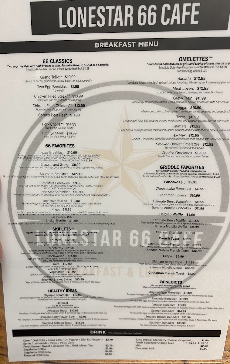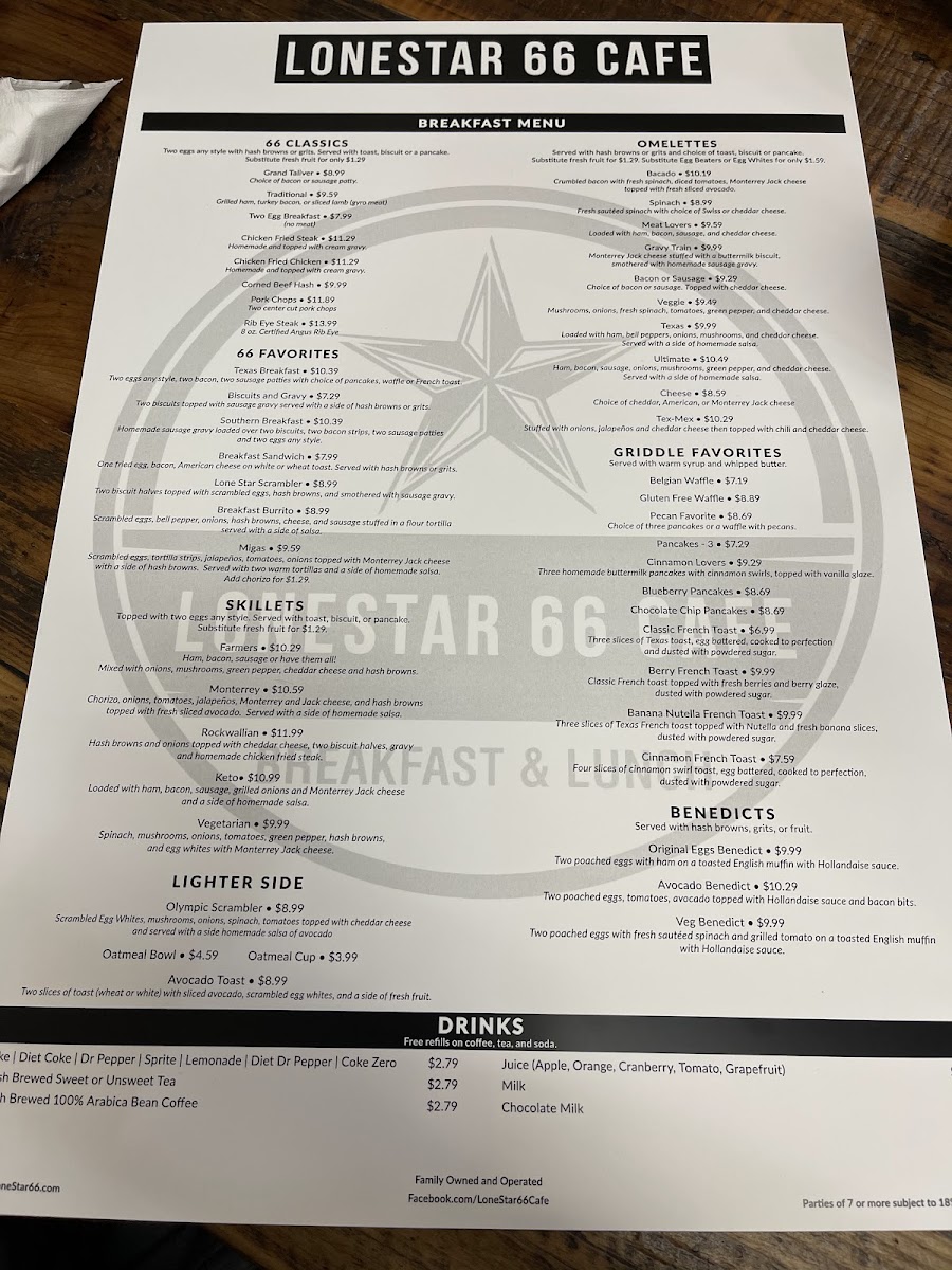 For sides, you can’t go wrong with choices like crispy Hashbrowns or a classic Pancake. The drink menu features refreshing options like freshly brewed Sweet Tea and smoothies, perfect for pairing with meals. Overall, Lone Star 66 Cafe promises an inviting atmosphere and a menu that captures the essence of Texas comfort dining, making it a must-visit for locals and travelers alike!